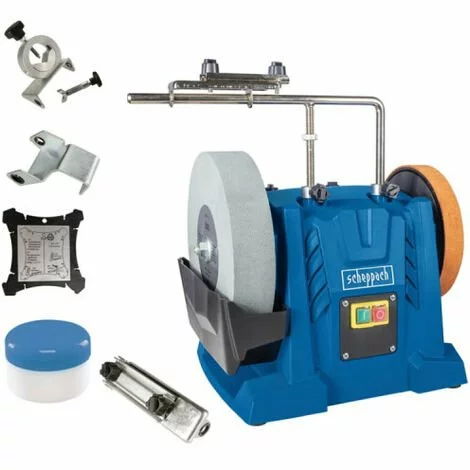 Ce pack SCHEPPACH comprenant une affuteuse à eau 250mm et ses accessoires : ces dispositifs 40-55-70, une pâte d’affilage et un guide d’angle est prêt à l’emploi pour vos travaux d’affutage. En effet, l’association de cette affuteuse à eau avec le dispositif 55 pour gouges vous permettra d’aiguiser et d’entretenir différents produits comme les tranchants obliques, les gouges et les ciseaux à bois. En outre, avec le dispositif 40 pour haches, vous pourrez maintenir votre hache pouvant mesurer jusqu’à 170 mm de longueur, pour les affuter. De plus, vous pouvez retrouver avec votre affûteuse, un dispositif 70 universel qui est compatible avec de multiples produits, un positionneur d’angle et une pâte d’affilage qui vous permettra de parfaire l’affûtage en polissant parfaitement le tranchant de vos outils.