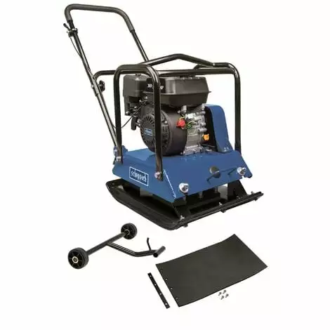 Inclus dans le package est un tapis en caoutchouc et un chariot équipé de roues pour transporter facilement le compacteur.